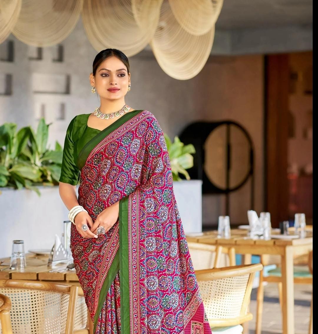 Introducing our Surreptitious Black & Red Digital Printed Crape Silk Saree! Made from luxurious crape silk, this saree is perfect for those who want to look effortlessly elegant in no time. The beautiful digital print adds a touch of modernity to this traditional outfit. Simply drape it on and you’re ready to rock any occasion!